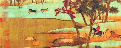 《浴马图卷》结合青绿山水与浅绛山水两种画法,在颜色的罩染和墨色的处理上显得极为协调。而色墨关系至今仍是中国画需要深入研究的课题。