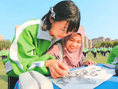 9月20日,作为2017中国(安阳)国际汉字大会的重要内容之一“汉学家进校园”活动在河南省安阳市实验中学举行。图为史玉静同学正在手把手地教来自马来西亚的“姐姐”铅笔绘画。毕兴世/人民图片