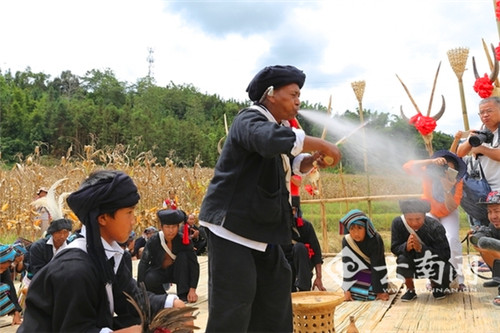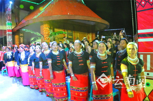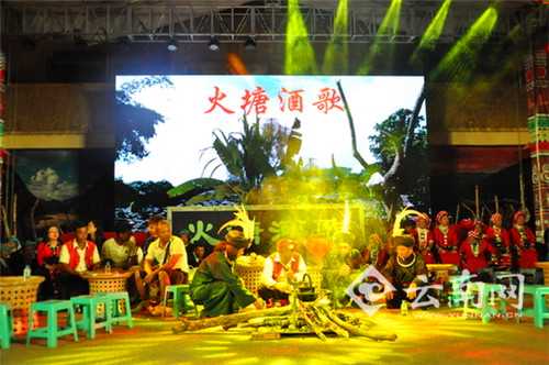 10月4日晚,云南省沧源县在葫芦小镇举行火塘酒歌--佤族原生态风情文化展,艺人和嘉宾们围坐在火塘边,以原生态歌舞、煮茶、品酒等形式展示多彩的佤乡风情,欢庆中秋佳节。