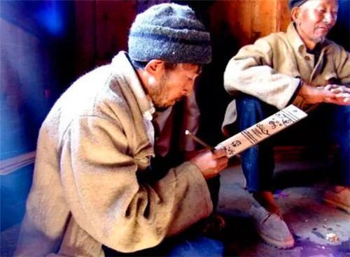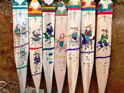 进入21世纪以来,每年的大年初五,金山乡贵峰三元村森敖家族近50户人家就会聚集在家族祭天场,如同远古的纳西先民一般举行祭天仪式。只是世易时移,他们不再拜神,只为了传承好纳西族先民用千年智慧创造,用千年毅力传承下来的民族文化。森敖家族的祭天仪式在一套完整而严谨的规程中进行着。而在祭天的整个过程中,最为重要的一种载体是由东巴制作的木牌画,这个仪式中的木牌画上,尖头画神,平头画鬼。尖头木牌画围绕水井,寓意着神灵正在护佑生命之源。