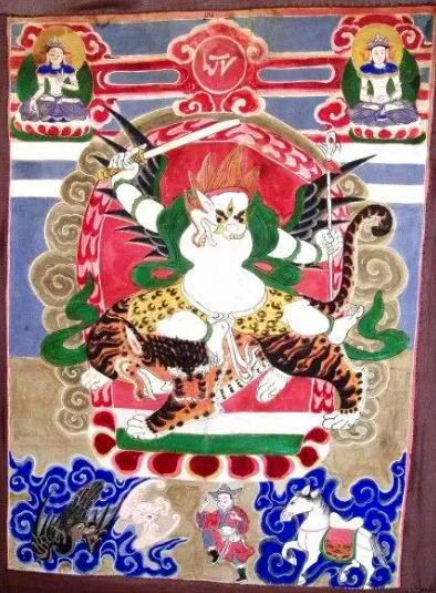 从石刻画到木牌画再到纸牌画和卷轴画,纳西族人主动选取更便捷的文化载体进行创作,有效推动了东巴画艺术的传承和传播。木牌画画风古朴、粗犷而单纯,与东巴文造型特点完全一致。相比之下,这幅卷轴画造型严谨,构图紧凑,技法成熟。与藏族唐卡有几分相似之处。