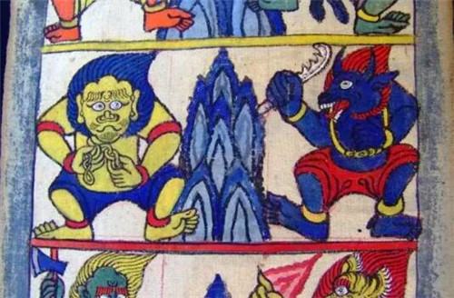 《神路图》主要用于丧葬时超度死者亡灵仪式中,整副图描述了死者亡灵要经过的地狱、人间、自然界、天堂等各阶段的具体场面,表现了天堂、人间、地狱三界以及生死轮回的过程,他用连环画式的画面反映了纳西族先民灵魂不灭的生命意识和完善人生的伦理观念。