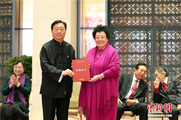 中国国家博物馆馆长吕章申(左)向中国紫檀博物馆馆长陈丽华颁发收藏证书。中新社记者 张宇 摄