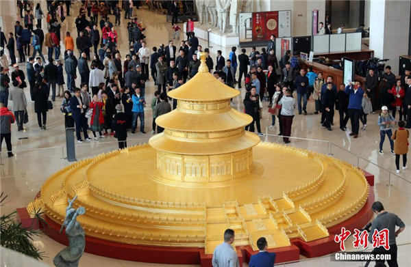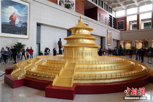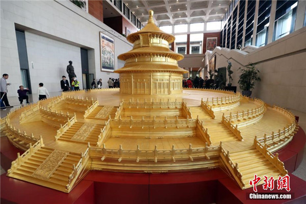10月15日,由中国紫檀博物馆制作的“著名古建筑天坛祈年殿制作模型”捐赠收藏仪式在中国国家博物馆举行。祈年殿模型整体结构完全以原建筑物为准,选用珍贵的缅甸柚木,手工贴三层24K99金箔;模型以1:10的比例,并采用中国传统的榫卯结构雕制而成,直径9米,高3.8米。中新社记者 张宇 摄