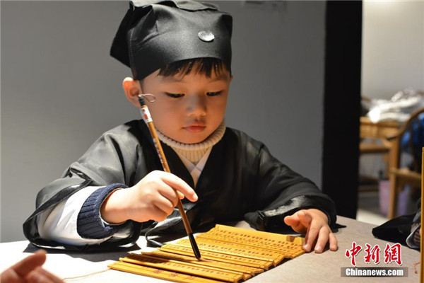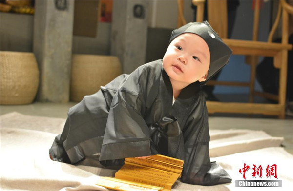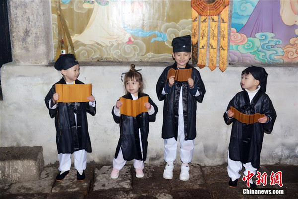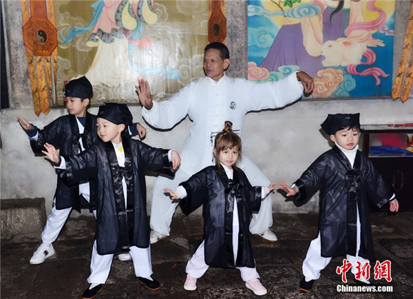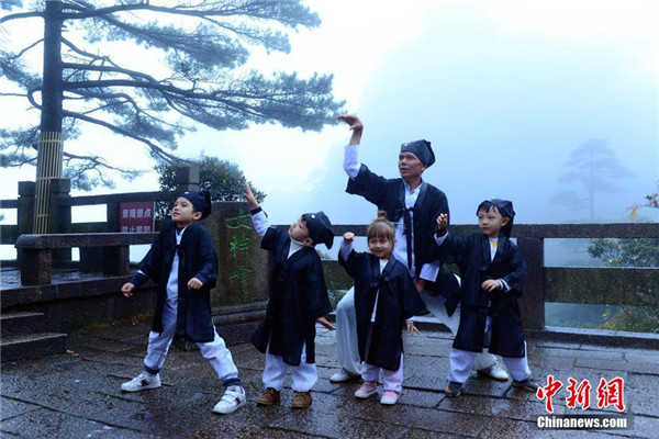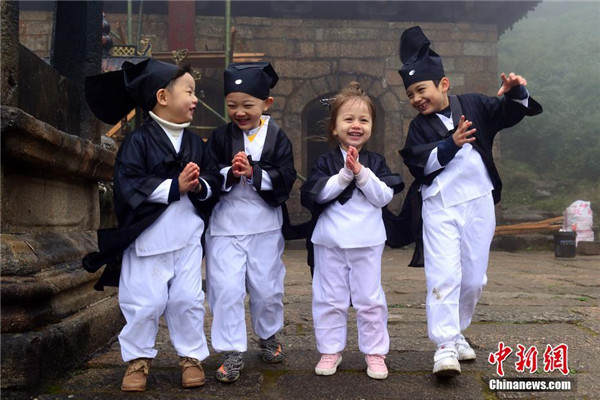 10月16日,在“道教名山”、世界自然遗产地江西上饶三清山,5名来自中外的萌娃身穿统一道服,手持竹简,在三清宫跟着道教师傅朗读《道德经》、《弟子规》,学习太极拳、书法、古筝等中国传统文化。这群萌娃中年龄最小的仅11个月,年龄最大也只有6岁。程希雪 摄