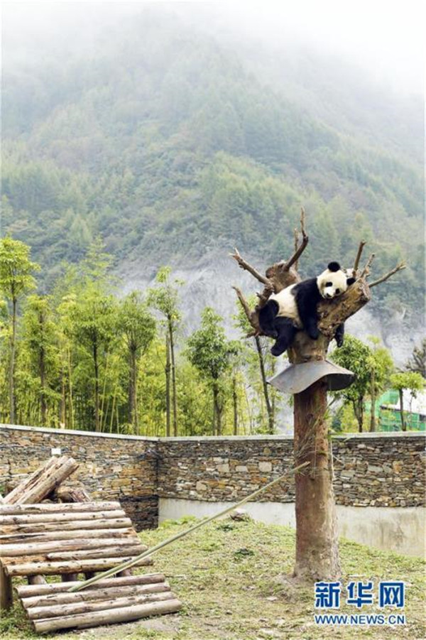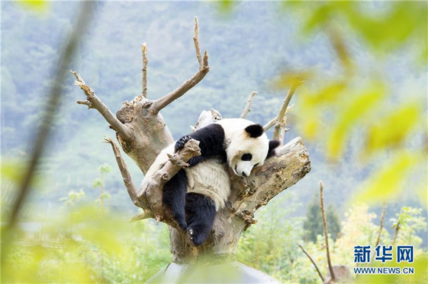 10月20日,在四川卧龙中华大熊猫苑神树坪基地,一只大熊猫在树杈上休息。新华社记者 张帆 摄