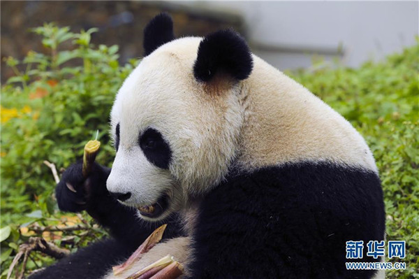 10月20日,在四川卧龙中华大熊猫苑神树坪基地,一只大熊猫在享用美食。新华社记者 张帆 摄