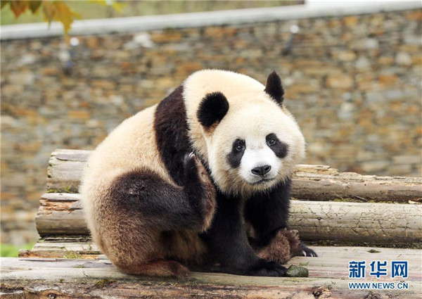 10月20日,在四川卧龙中华大熊猫苑神树坪基地,一只大熊猫在平台上玩耍。新华社记者 张帆 摄