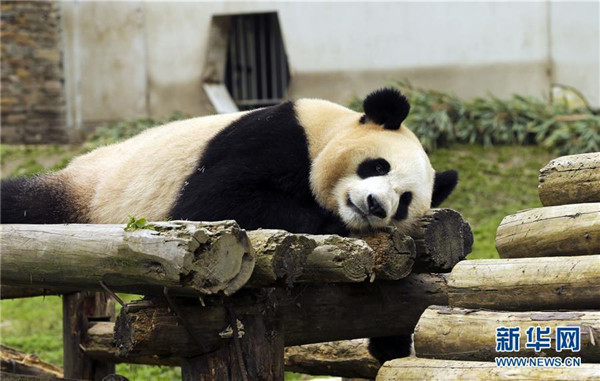 10月20日,在四川卧龙中华大熊猫苑神树坪基地,一只大熊猫趴在台子上休息。新华社记者 张帆 摄