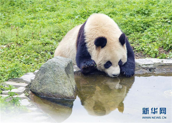 10月20日,在四川卧龙中华大熊猫苑神树坪基地,一只大熊猫在池边喝水。新华社记者 张帆 摄