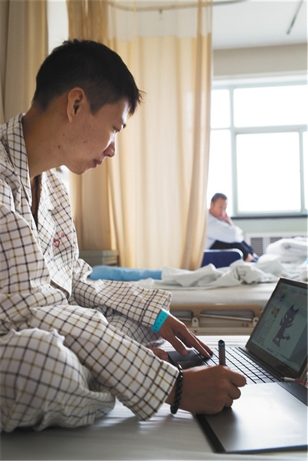 丁一在病床上坚持画漫画,他说有病友因为看到画变得乐观,他就有了继续画的动力。受访者供图