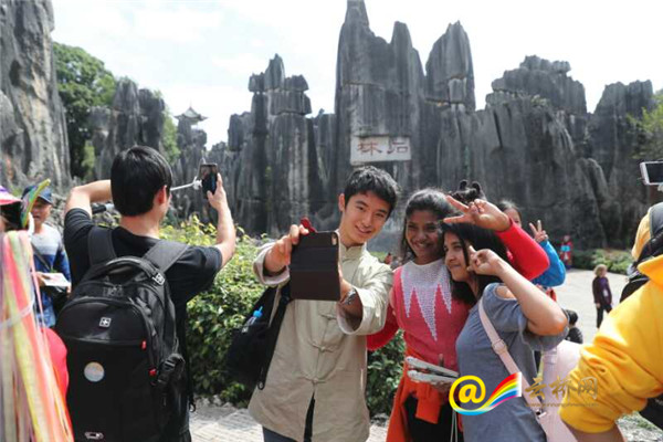 在小石林阿诗玛石像前,阿诗玛的传说让大家听得津津有味。“凄美的爱情故事,使这些本已非常美丽的风景更加生动、鲜活。”格林纳达中学生查德认为,自然风光和民族文化的深度融合,是石林充满魅力的重要原因。“彝族是一个热情的民族,有机会我想深入了解他们的文化,以便更全面地认识云南。”听到查德的话,已接待过两届“汉语桥”选手的景区导游刘巧仙便详细地为他介绍起来。
