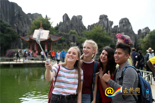 当天,持续阴沉的天空逐渐放晴,蓝天白云下,整个石林也明亮起来,石牙、峰丛、池塘、草地等景观清晰可见。“这里绝对是喀斯特地貌的精华,不仅分布面积广,而且类型齐全、形态独特,令人叹为观止。”走进大石林,来自阿富汗的中文老师阿里立刻被眼前的景象深深吸引:“我们国家也有很多山和石,但如此巧夺天工的,还是第一次见。”