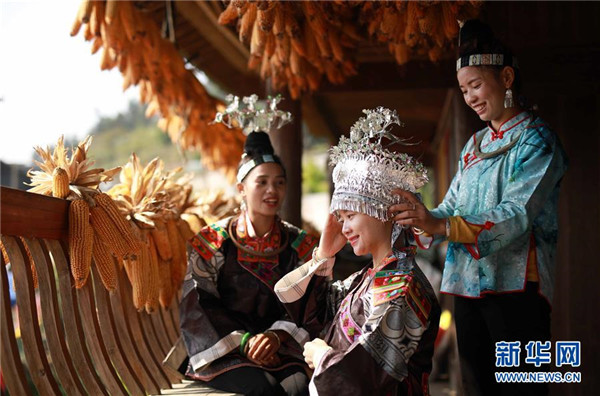 10月30日,贵州省黔东南苗族侗族自治州丹寨县扬武镇排莫村,苗族女孩子在节日中妆扮。新华社发(黄晓海 摄)