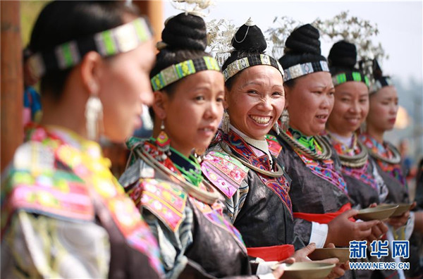 10月30日,贵州省黔东南苗族侗族自治州丹寨县扬武镇排莫村,苗族村民手端酒碗迎宾。新华社发(黄晓海 摄)