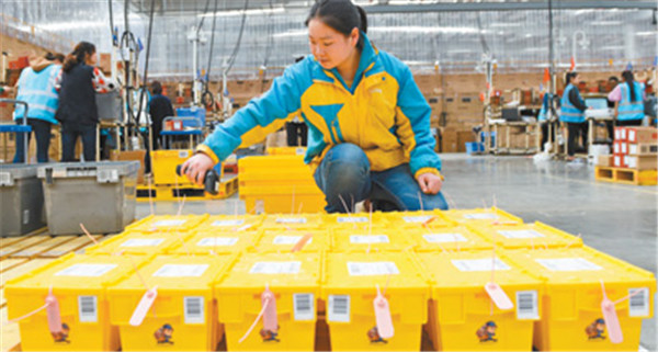 10月31日,江苏南京苏宁云仓物流基地的工作人员在扫描“共享快递盒”信息,确认商品。电商物流将智能包装和末端服务相结合,采用可回收循环利用的特制快递包装盒代替传统常用纸箱,不仅节约了成本,还能避免产生大量包装垃圾。