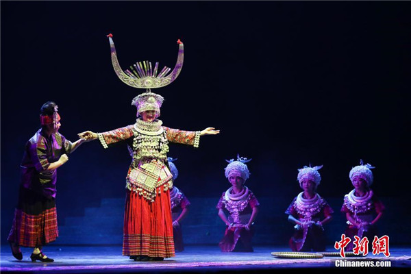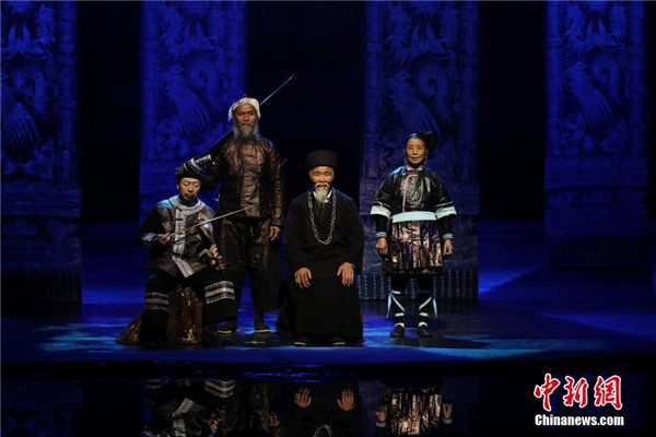 11月1日晚,四位少数民族演员在演绎苗族古歌。中新社记者 贺俊怡 摄