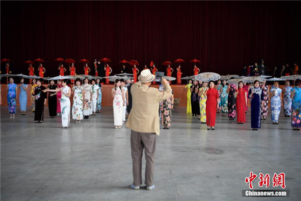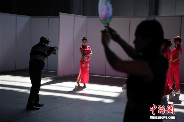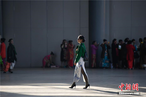 11月1日,旗袍爱好者走秀前抓紧排练。中新社记者 刘冉阳 摄