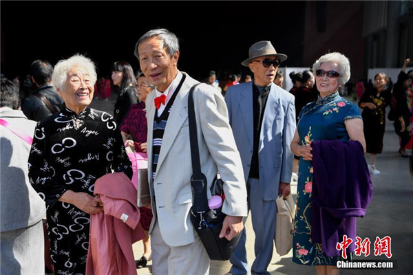 1月1日,81岁的王玮(左一)和84岁的李茂群(右一)在老伴的陪伴下来参加活动。中新社记者 刘冉阳 摄