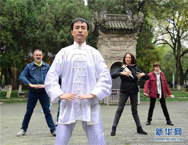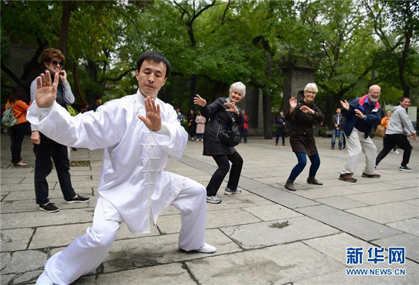 11月1日,赵庆(前)在小雁塔景区内向外国游客教授杨氏太极拳动作。在“不务正业”跨界这件事上,西安“80后”小伙赵庆一认真起来,就坚持了十几年。新华社记者 邵瑞 摄