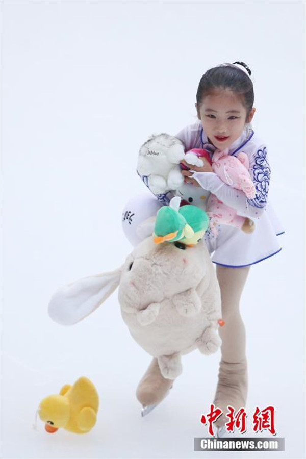 11月3日,由国际滑联主办的2017年中国杯世界花样滑冰大奖赛在北京开幕。本届比赛共吸引了来自11个国家的60名顶级花样滑冰运动员前来参赛。图为赛后小冰童帮忙拾起观众投掷的娃娃。中新社记者 韩海丹 摄