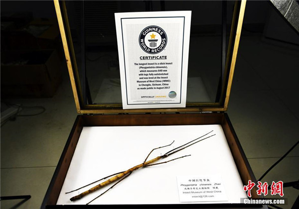 图为中国巨竹节虫(Phryganistria chinensis Zhao )最长个体,与获得的吉尼斯世界纪录证书。中新社记者 安源 摄