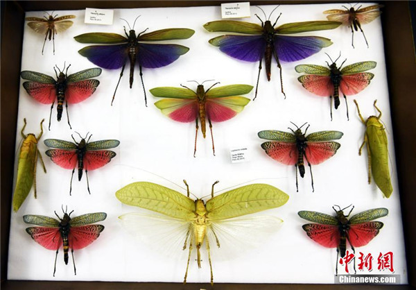 图为11月4日拍摄的馆藏蝗虫标本,正中下方为中国最大螽斯——巨拟叶螽。中新社记者 安源 摄