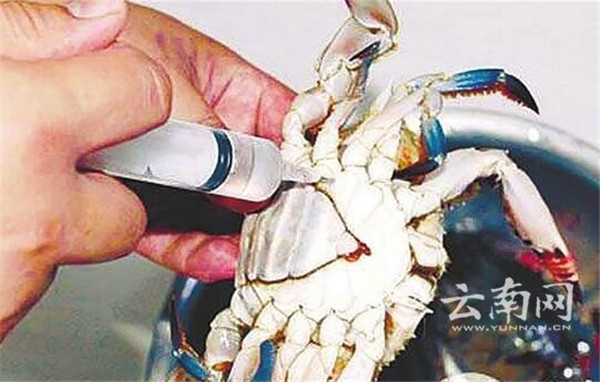 甘炼说,用针筒给蟹注射不明液体,实际上是浙江当地酒席上的一种做法,在蟹烹饪前往螃蟹注射黄酒等调料,而且这种烹饪方式只集中在梭子蟹或青蟹等肉蟹中。