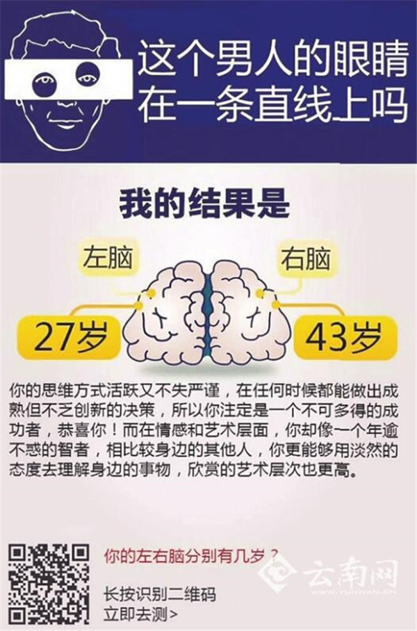 流言:“左右脑年龄测试”风靡朋友圈,左脑负责语言、右脑负责图像,根据测试可以得出左右脑的“年龄”。
