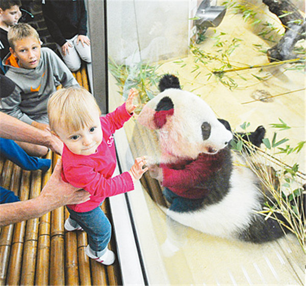 2014年8月14日,一位小朋友在奥地利维也纳美泉宫动物园参观大熊猫。新华社发