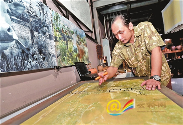 走进普洱河图艺术坊的工作室,普洱绝版木刻艺术家刘曙平正在创作自己的木刻作品。刘曙平是土生土长的哈尼族,从小爱画画,长大后专业学习油画,后拜师学习木刻,其木刻刀法粗犷,构思精巧,作品题材大多取材于普洱的自然风光、民族风情等及傣族、哈尼族、拉祜族等各民族团结互助、共同发展的故事。