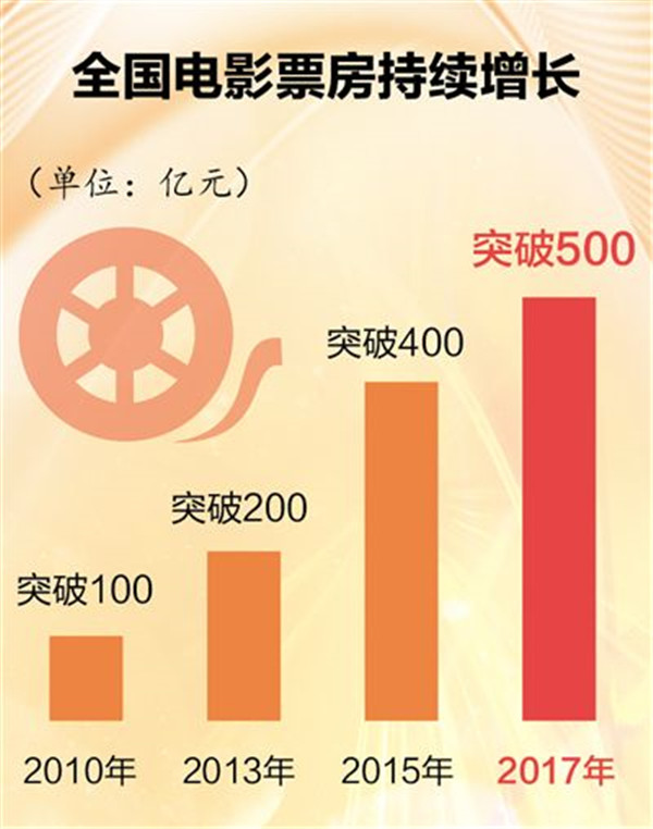截至11月20日,2017年全国电影总票房突破500亿元大关,创下新纪录。从2003年电影产业化改革启动时的全国总票房10亿元,到只用324天即突破年票房500亿元,中国电影只用了短短十几年,这是世界电影史上都未曾有过的速度。业内人士指出,中国电影产业的迅速发展得益于改革释放出的巨大活力,在十几年改革的积累下,中国电影已经跃上了一个全新的发展台阶,正在改写着以好莱坞为单极话语权的世界电影格局。