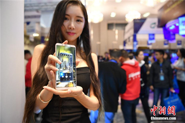 11月22日,模特展示应用最新技术的手机。中新社记者 刘冉阳 摄