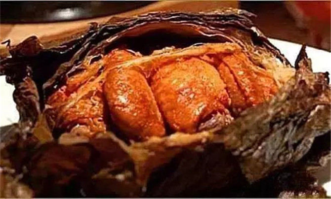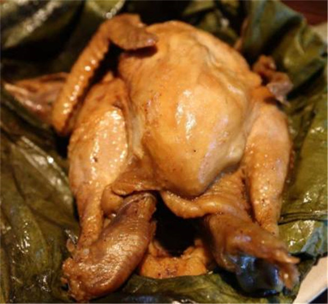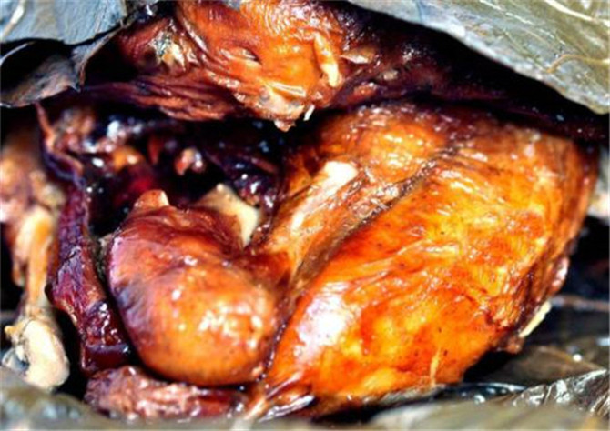 一层用香茅草、二层用玻璃纸,第三层用荷叶,然后用麻绳捆扎结实,用黄泥、绍酒、盐调成泥状,涂抹在上面,用白纸包住,将泥团(腹朝上)放入炭火烘箱,先用旺火高温烘烤至泥土变色,随后,调至温火烤3-4小时取出,除去泥,加花椒盐、辣酱油一起上桌。