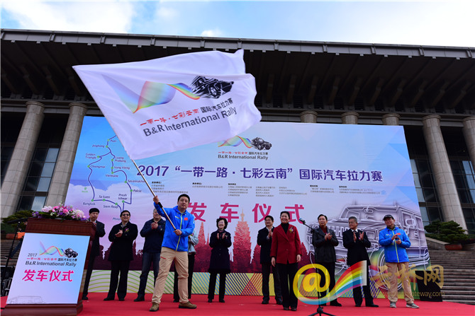 发车仪式上,云南省人大常委会副主任刀林荫向车队副领队授旗,并宣布2017年 “一带一路•七彩云南”国际汽车拉力赛正式启程。