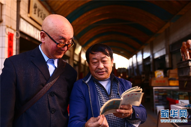 李进在给一位客人介绍小人书,说到开心的地方,两个人一起笑起来。