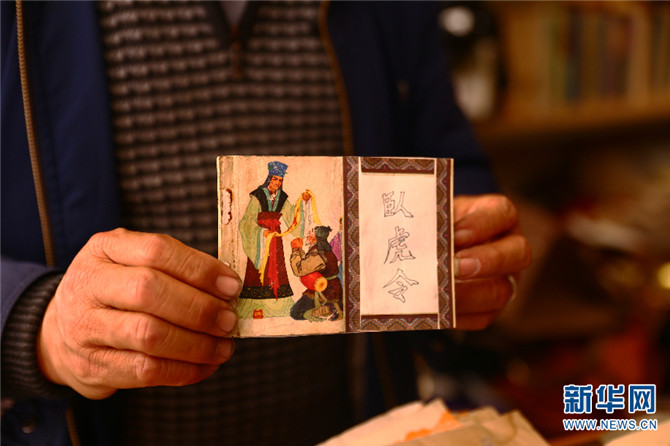李进手上拿着的是一本1981年人民美术出版社出版的《卧虎令》,封面的一半已做了修补。这本书是他的一个老顾客送他的。这位顾客已经在他的书屋淘小人书十多年了,两人也逐渐成为好朋友,经常会交流一些关于收藏的心得。