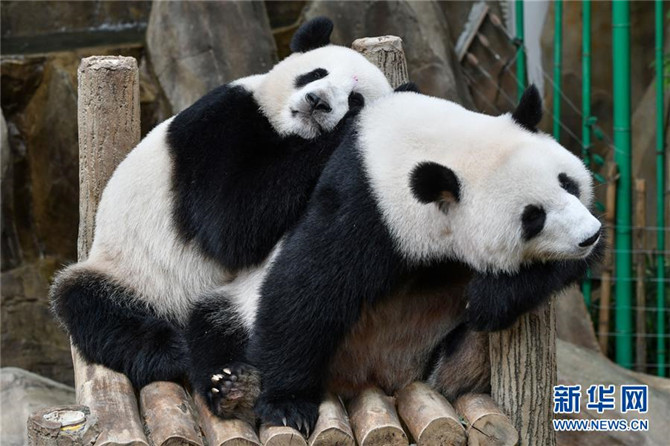 这是2017年8月23日,在马来西亚吉隆坡,大熊猫“暖暖”(左)偎依在母亲“靓靓”身上。当日,马来西亚国家动物园为同为8月出生的大熊猫“兴兴”“靓靓”以及它们的熊猫宝宝“暖暖”庆祝生日。“兴兴”和“靓靓”同为8月23日出生,当天是它们的11岁生日。“暖暖”则出生于2015年8月18日。新华社发(张纹综 摄)