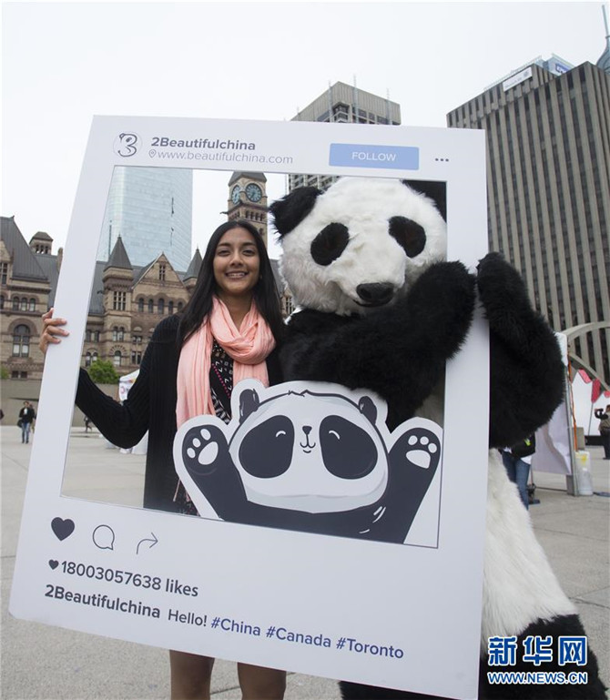 这是2017年5月19日,在加拿大多伦多市政广场,一名游客在中国旅游文化节上与熊猫人偶合影。主题为“熊猫走世界——美丽中国”的2017年加拿大中国旅游文化节当日在多伦多市政广场举行。新华社发(邹峥 摄)