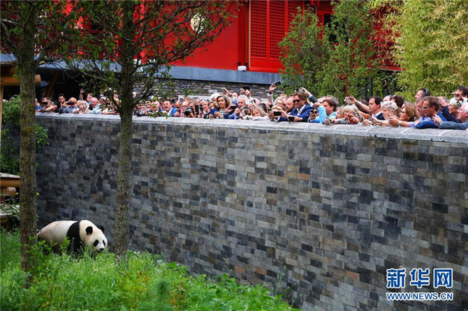这是2017年5月30日,人们在荷兰乌得勒支省雷嫩市的欧维汉兹动物园观赏大熊猫“武雯”。来自中国大熊猫保护研究中心的两只大熊猫“星雅”和“武雯”在度过一个多月的检疫期后,于当日首次与公众见面。新华社记者 龚兵 摄