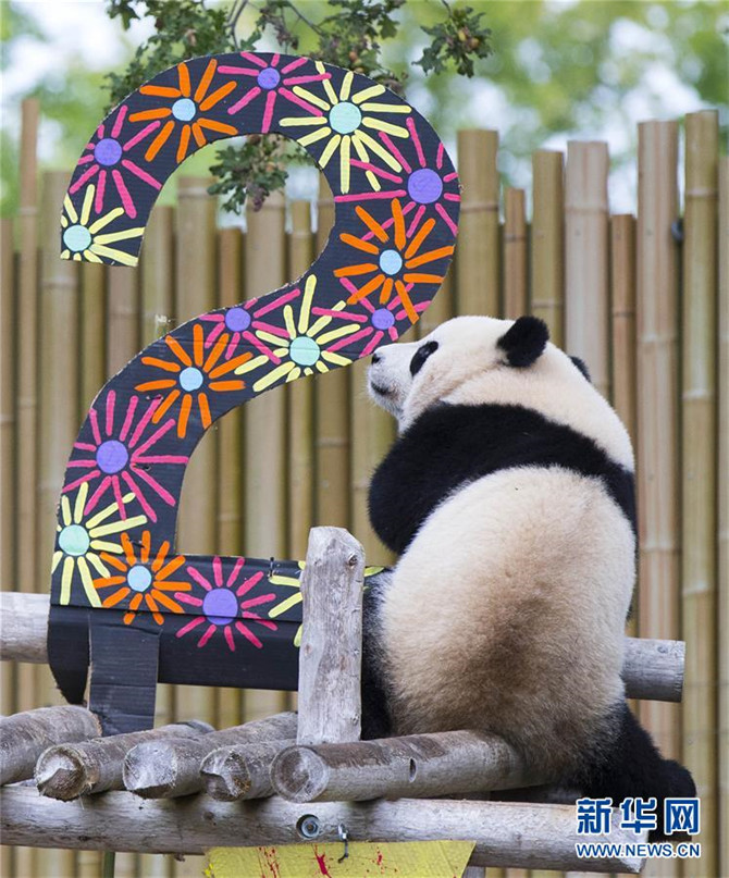 当日,美国国家动物园举行活动庆祝大熊猫“贝贝”的两岁生日。“贝贝”出生于2015年8月,是在美国国家动物园出生的第三只大熊猫。其父母是于2000年抵美的大熊猫“添添”和“美香”。新华社发(杨承霖 摄)