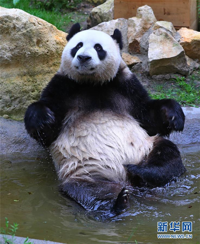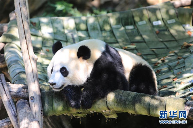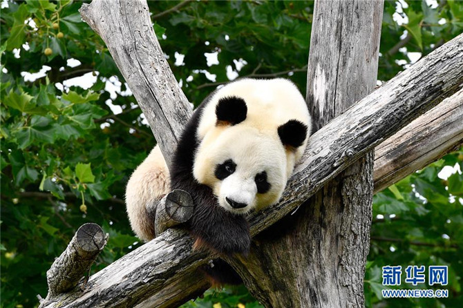 这是2017年8月4日在法国圣艾尼昂博瓦勒野生动物园拍摄的大熊猫“圆仔”。“欢欢”与“圆仔”于2012年被送至法国,进行为期10年的中法大熊猫繁育合作计划。新华社记者 陈益宸 摄