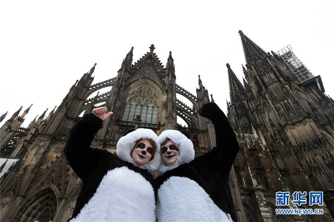 这是2017年2月27日,在德国科隆,“玫瑰星期一”大游行上装扮成熊猫的狂欢者经过科隆大教堂。新华社记者 罗欢欢 摄