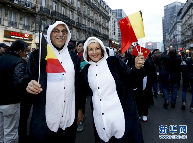 这是2017年1月28日,在比利时布鲁塞尔,一对夫妇装扮成熊猫参加春节巡游。新华社记者 叶平凡 摄