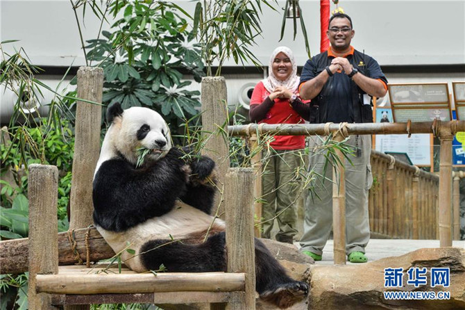 时值2017年农历新年来临之际,在位于马来西亚吉隆坡市郊的国家动物园里,饲养员们和熊猫馆里的大熊猫“兴兴”和“靓靓”以及它们的熊猫宝宝“暖暖”一起送上新年的祝福。新华社发(张纹综 摄)