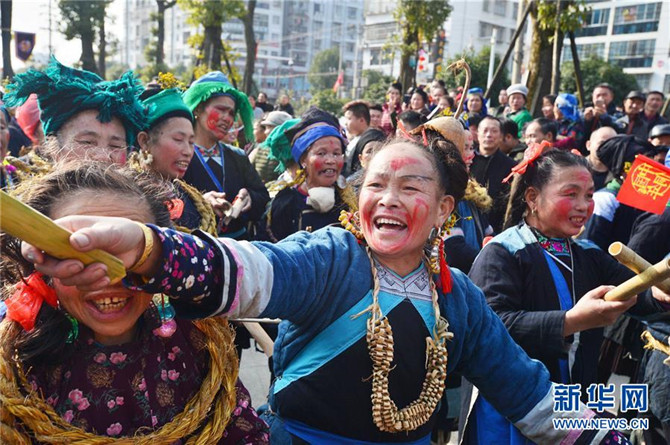 12月18日,侗族同胞在巡游中表演“脸花闹”。新华社发(乔启明 摄)