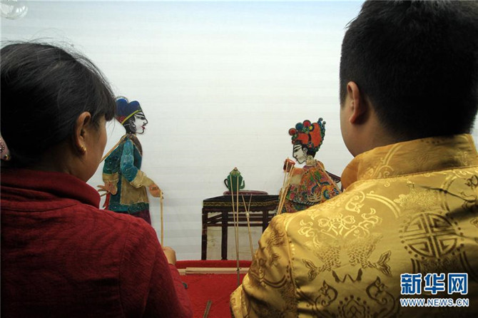 11月23日,刘朝侃(右)在位于腾冲高黎贡国际旅游城的刘永周皮影馆内表演皮影戏。新华社记者 井辉辉 摄
