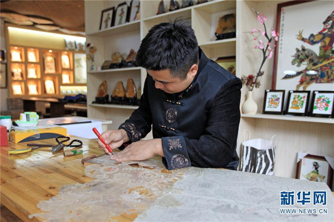 11月23日,刘朝侃在位于腾冲高黎贡国际旅游城的刘永周皮影馆内制作“皮靠子”。新华社记者 井辉辉 摄