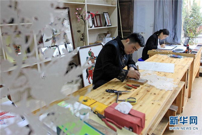 11月23日,刘朝侃(左)在位于腾冲高黎贡国际旅游城的刘永周皮影馆内制作“皮靠子”。新华社记者 井辉辉 摄