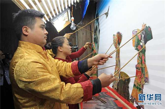 11月23日,刘朝侃(左)在位于腾冲高黎贡国际旅游城的刘永周皮影馆内表演皮影戏。新华社记者 井辉辉 摄